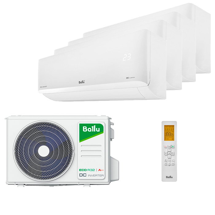 Мульти сплит система Ballu на 4 комнаты (20+20+25+25 кв.м) серия Multi Smart - новинка среди бренда Ballu, с тихими внутренними блоками. Во внутренних блоках предусмотрен USB разъем для подключения wifi модуля, а также дополнительный каталитический фильтр тонкой очистки. Данная модель комбинируется с наружными блоками на R32 фреоне из линейки с завода Midea Multi Smart.