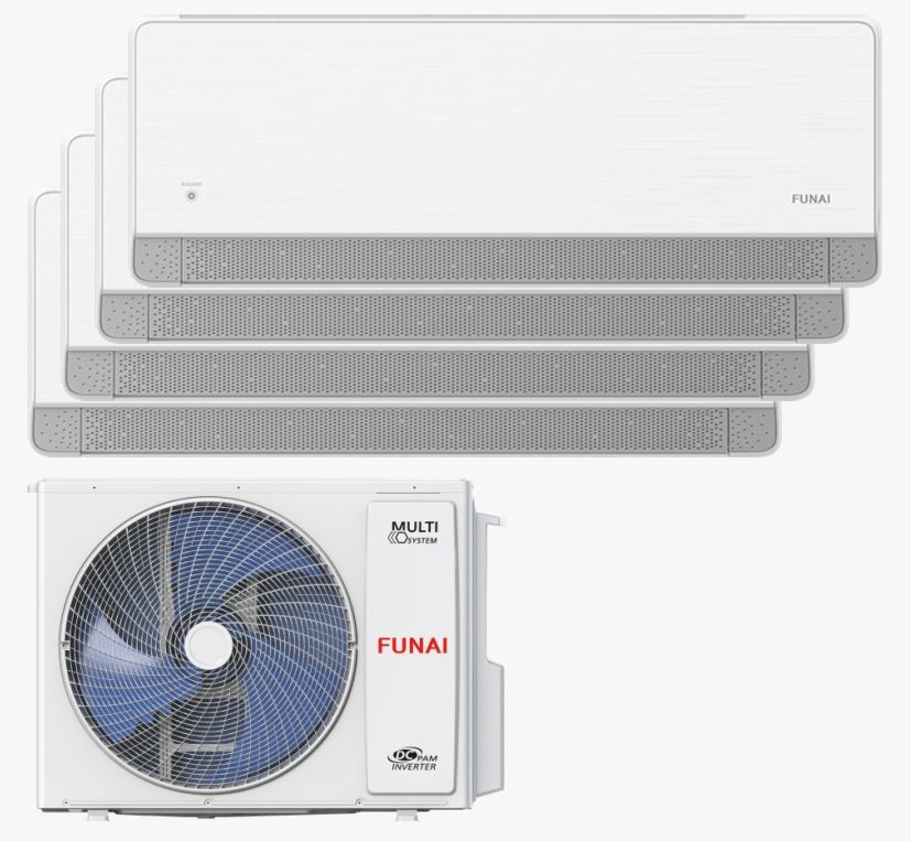 Мульти сплит-система Funai на 4 комнаты (25+25+25+25 кв.м.) серия KAGAMI White - создана для того, чтобы привнести в жизнь немного безмятежности посреди суеты. Сплит-системы оснащены функцией SMART Soft Breeze - внешними жалюзи особой формы с перфорацией, что обеспечивает деликатный обдув. А функция SMART Air позволяет управлять вертикальными и горизонтальными жалюзи.